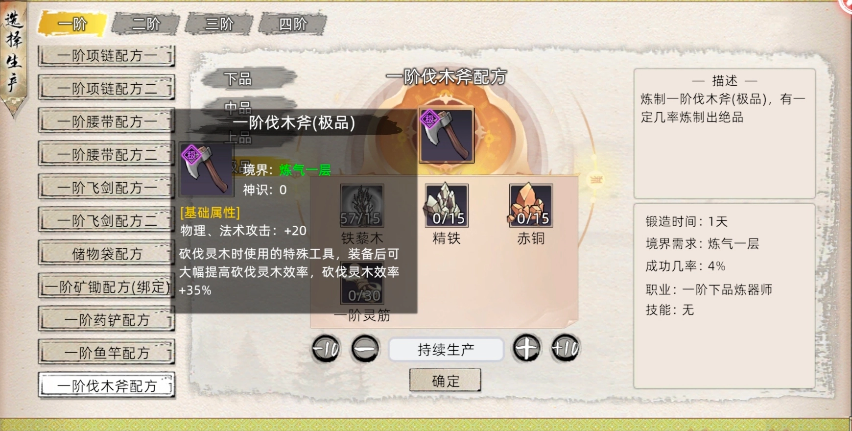 像炼器一样可以选择品质,同时也开放绝品选择项,所有品质的炼制材料一样但相应的基础成功率不同,每升一品成功率下降2%所要的职业品级也上一层。