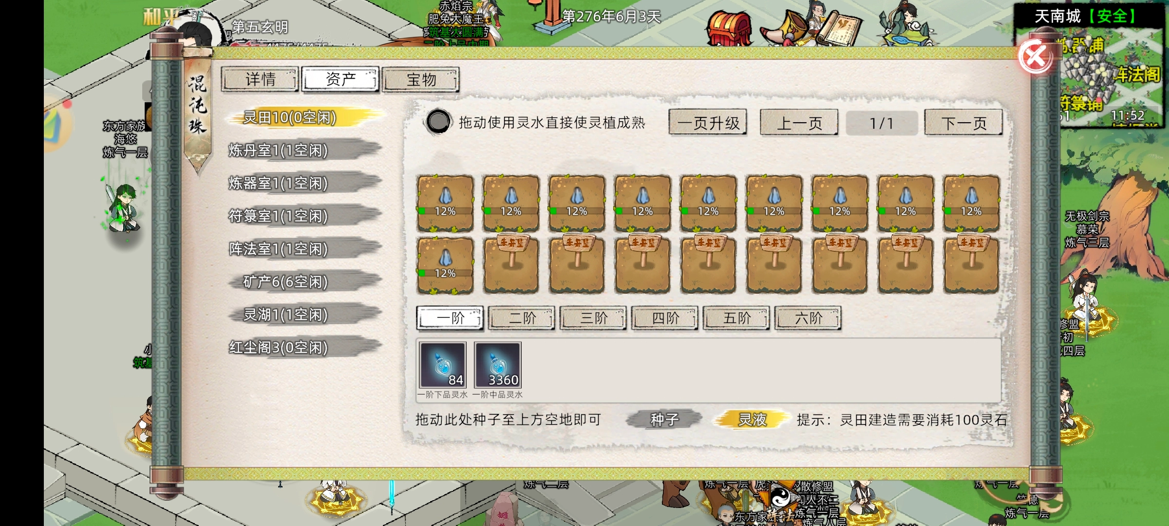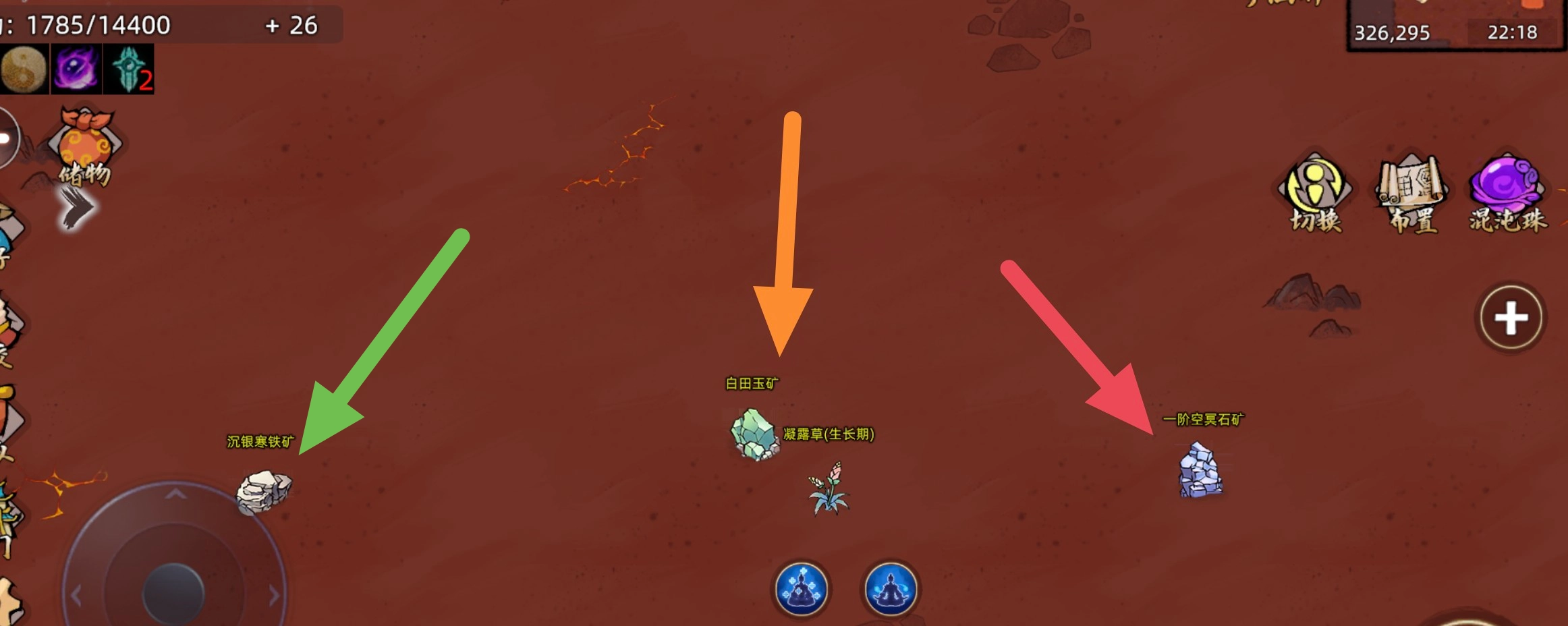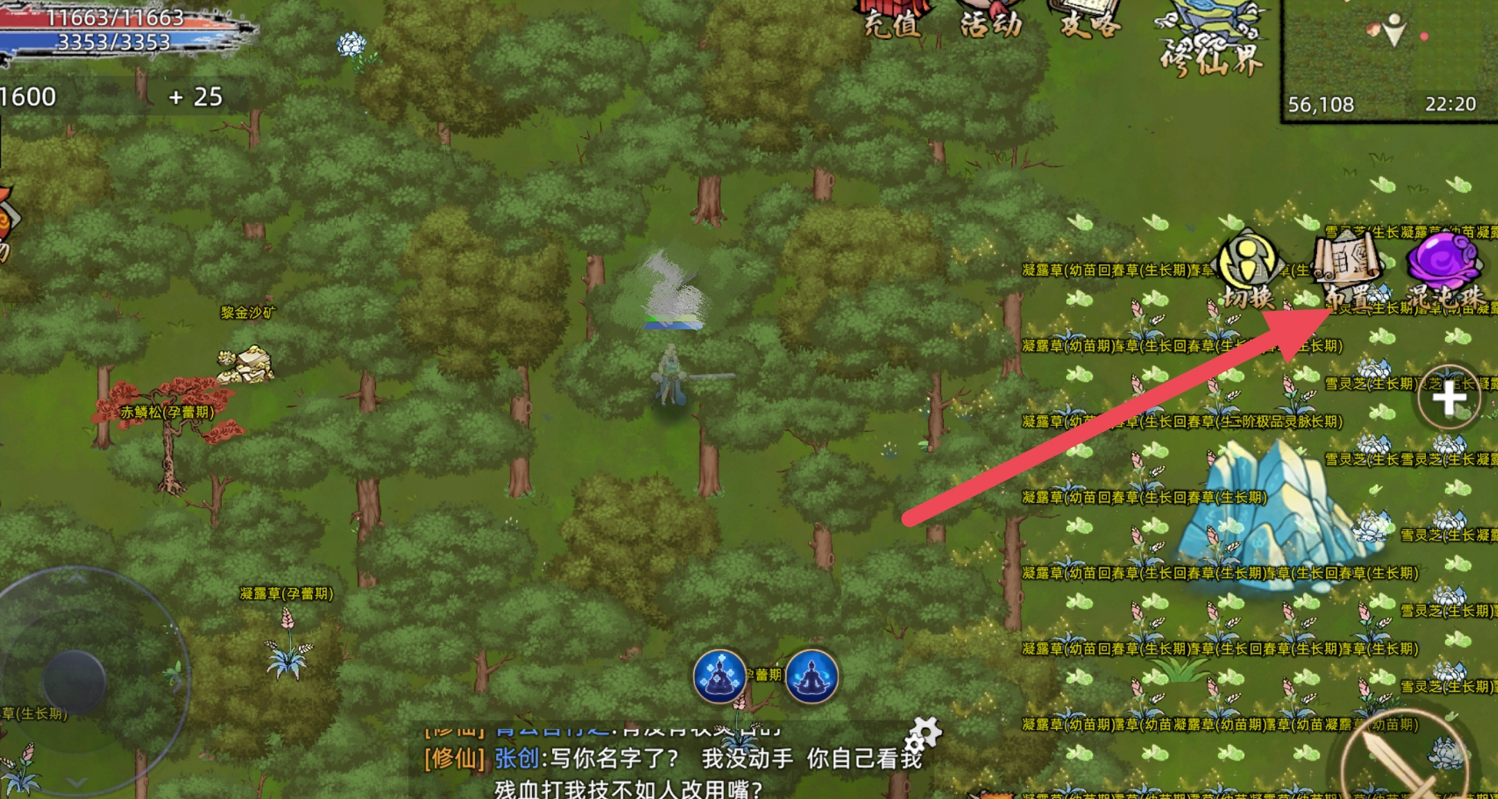 而往混沌珠灵田种只会产出绑定药草,如果我们要想获得非绑定药草去卖给其他道友,只能去非安全区采集或自己租洞府种等成熟。现在教大家大地图的种植方法,到非安全区后点击右边的布置