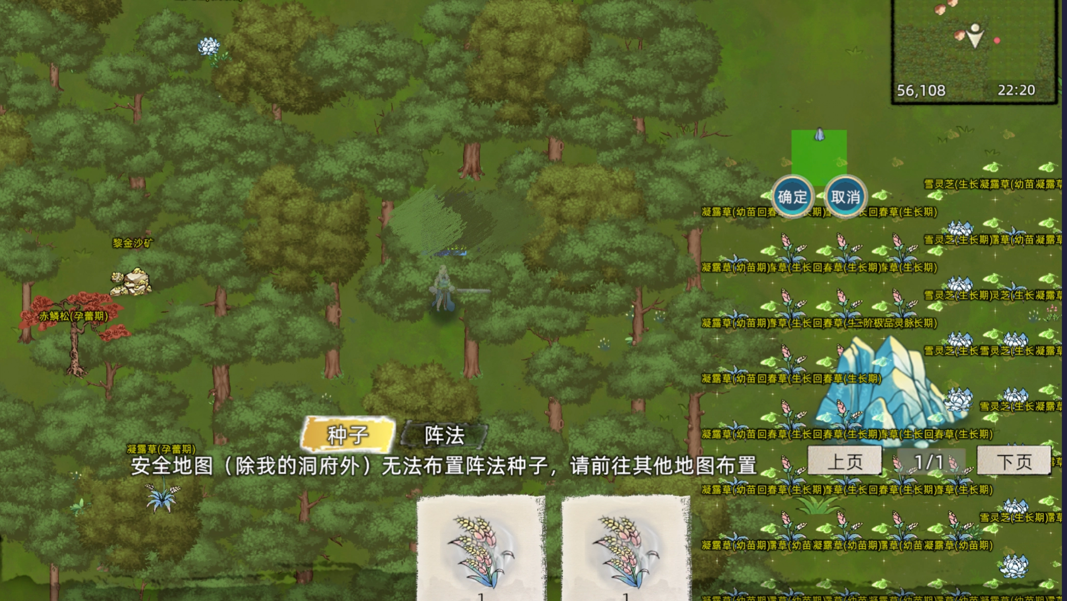 进入放置界面,在这里可以种植非绑定的药草种子和萌芽,拖动种子即可进行种植。同时布阵界面也在这个地方。