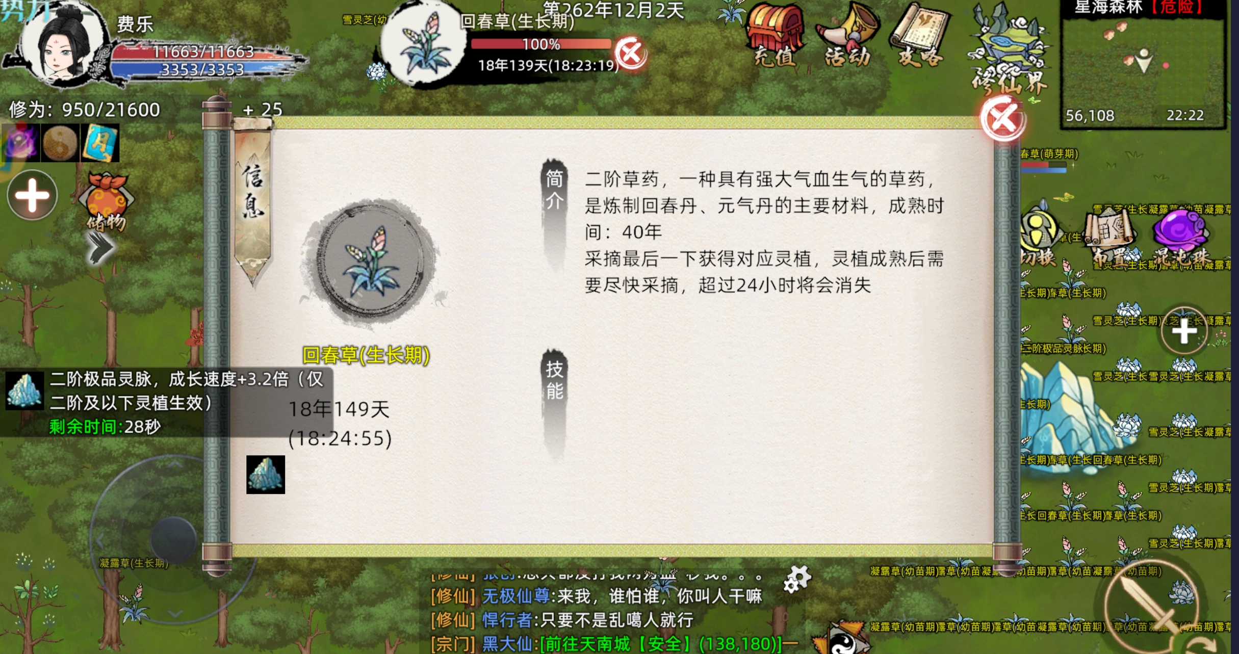 在藏经阁的生活辅修类别中,往下滑动页面,便能瞧见药草技能。该技能的效果为直接获取一定的成熟天数,以及加快成长速度。这两种种植方式所产生的效果能够叠加,因此我们通常会去租赁一个洞府,接着在洞府内的灵脉上种植灵草,同时运用技能来加速其生长。就如同我展示图里在野外种植的情况也行,不过你得留意防范他人偷取你的作物,并且要不惧被妖兽围攻而导致死亡。