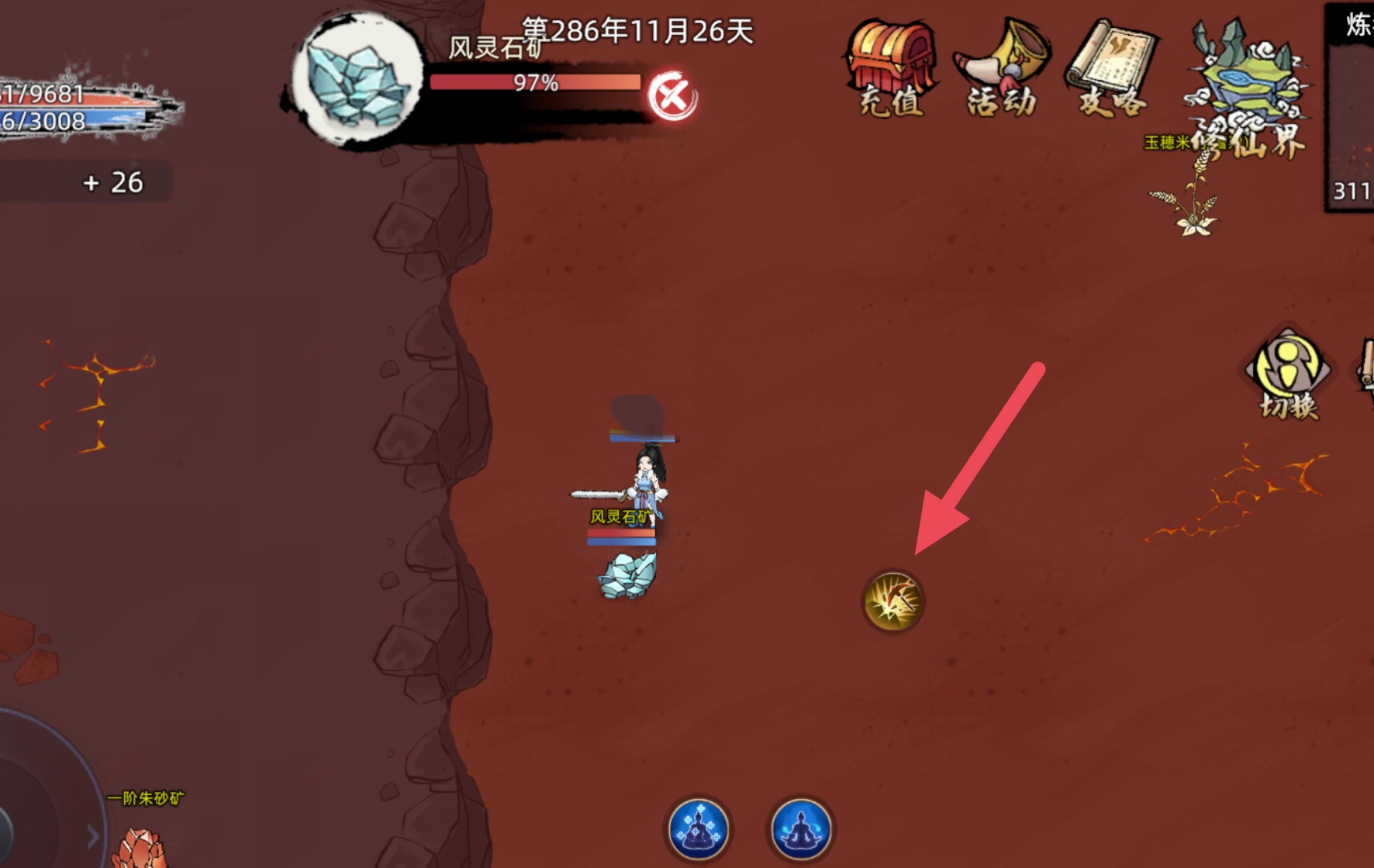 移动到矿附近后出现小锤子图标,点击小锤子图标就可以开始挖矿,期间会随机挖出矿渣以及一些其他同阶的矿石,但主要还是你所挖的那个矿,挖矿属性越高挖的越快,同时出现矿渣的几率也会越小。