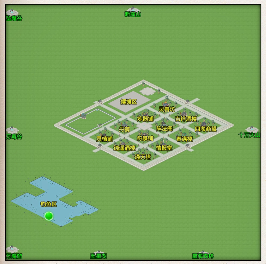 绿框为灵田区,随着混沌珠升级可开荒的田越多,点击灵田可以进行精确控制该灵田。