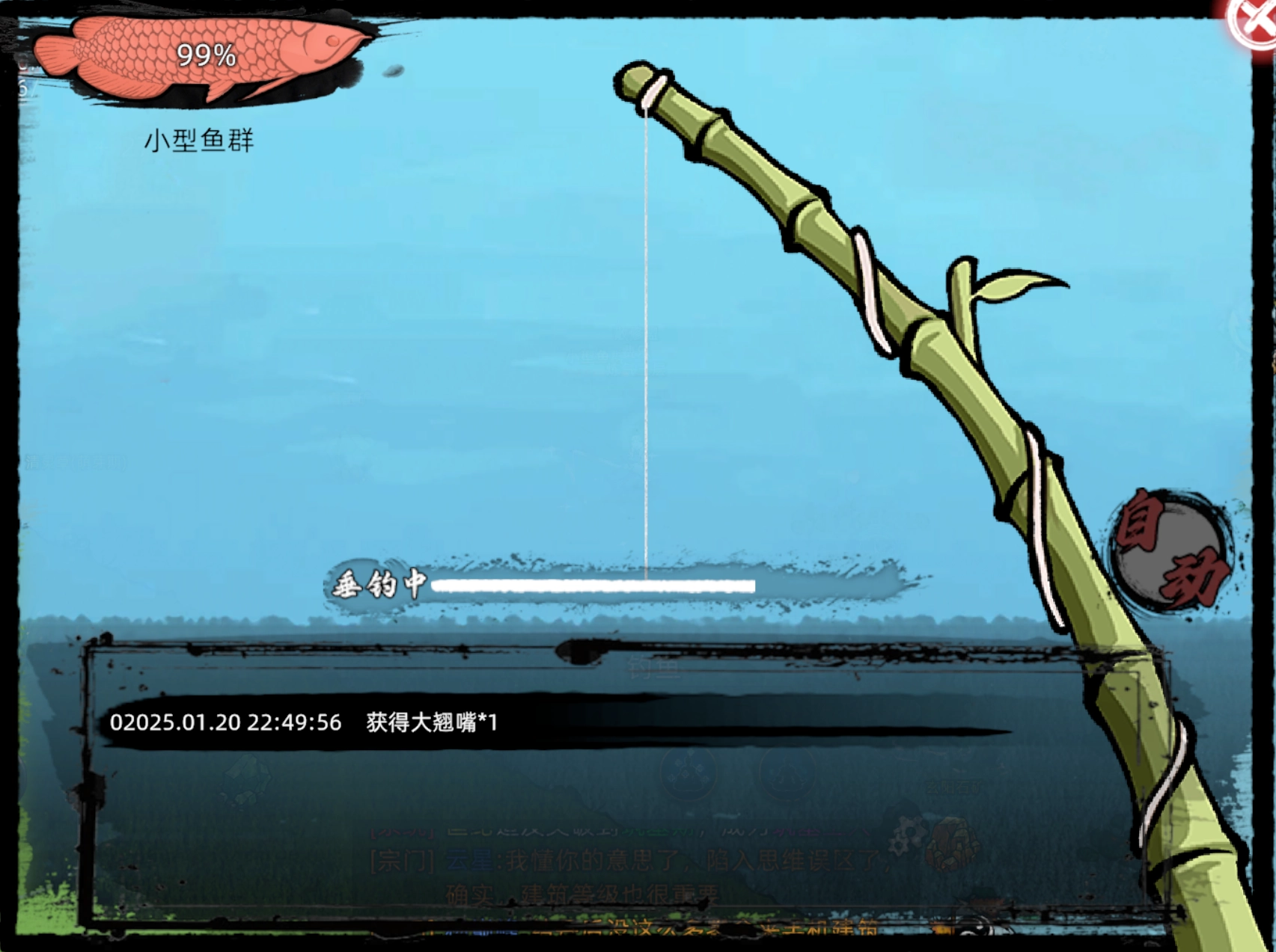 左上角展示的是鱼群血量,当血量耗尽,鱼群便会消失。右侧设置了自动垂钓功能,方便各位道友挂机。下方是信息栏,会显示玩家钓到何种鱼类。钓到的非绑定鱼,可拿去摆摊出售给其他道友。此外,天道碑与主城酒楼均设有对应的NPC,负责回收与售卖鱼类。在此特别提醒,钓鱼过程中有时会钓出水系妖兽以及宝箱,因此挂机钓鱼时,务必派出有战力的弟子出战,以防挂机时被钓出的妖兽击败。
