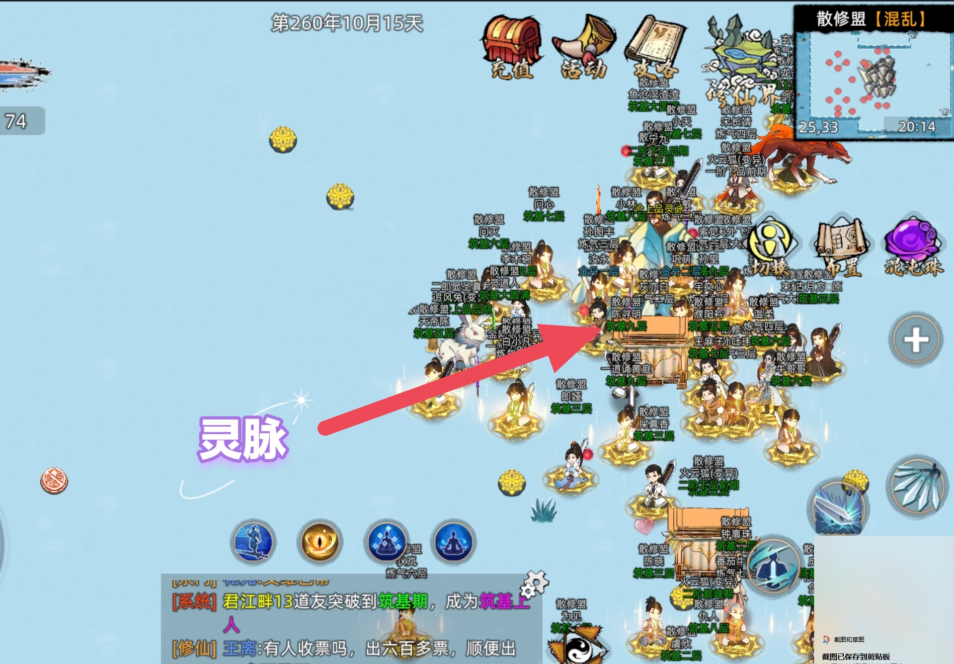 游戏里有天然灵脉山,只要在线时待在它周边,每天就能自动增加修为,范围大致为60%的视野范围,即只要能看到那座山就能获得修为加成。同阶极品的效果大约是提升120%的修炼速度,多座灵脉山的效果可以相互叠加。它在野外大地图的怪物群中、主城洞府以及npc宗门驻地都有分布。不过,要是注重安全,千万别去野外,否则服务器刷新妖兽时,你在附近可能会遭到一群妖兽围攻。下面我们以npc宗门的灵脉山为例: