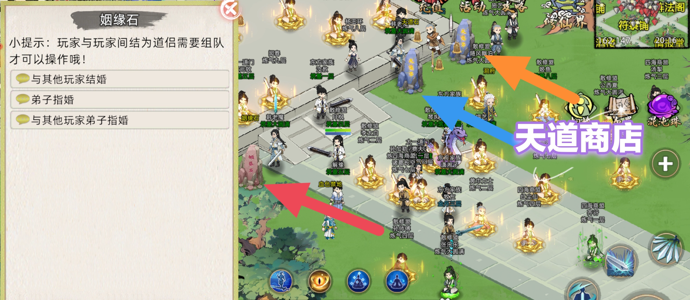 此界面点烟缘石按钮也可为弟子指婚,不必跑去天南中央,但是俩玩家结婚还是要到那去。