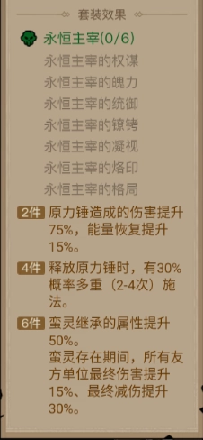 永恒主宰套装着重强化原力锤。其两件套效果为:原力锤伤害提升75%,能量恢复提升15%;四件套效果则是实现多重施法。