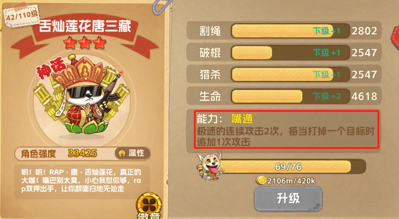 提及唐三藏的技能,【嘴遁】无疑是一大亮点!这绝非普通的吐槽与唠叨,而是凭借超快速的语速以及精准的韵脚,对敌人展开疾风骤雨般的连续攻击。每当成功击中一个目标,便会追加一次攻击,恰似佛门中的“连击咒”,使得对手根本无力招架。这哪里只是一场说唱对决,分明是智慧与速度的激烈较量!