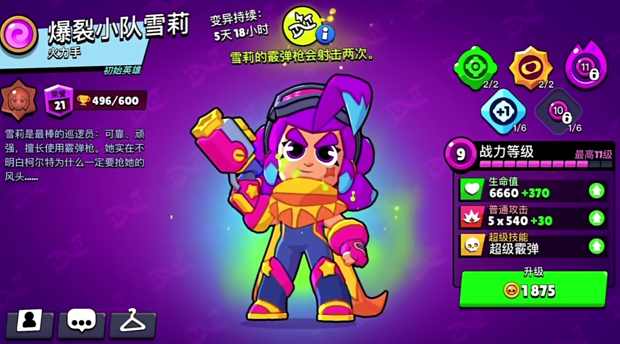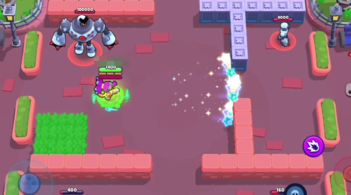 雪莉初始生命值为1400,攻击力达120,这一数值相对较高。正因如此,雪莉在游戏中的强度处于T0级别。雪莉共有两个技能,其一为超级霰弹枪。当雪莉成功击败五个敌方目标后,便可直接发动超级霰弹枪技能。此霰弹枪发射时会分为三束向前方发起攻击,每颗子弹的伤害值为200点。一旦成功命中敌人,敌人会向后被击退一小段距离,且在击退过程中,敌人会陷入僵持状态。