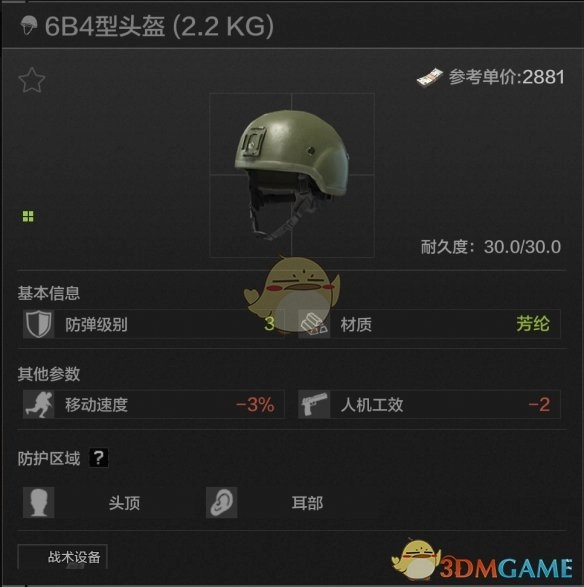 3该物品仅有30点耐久,具备头顶与耳部防护功能。不过,它存在较多负面效果,且由于采用芳纶材质,防护能力欠佳。其唯一优点是对耳朵有一定保护作用,总体而言,仅能勉强满足使用需求。