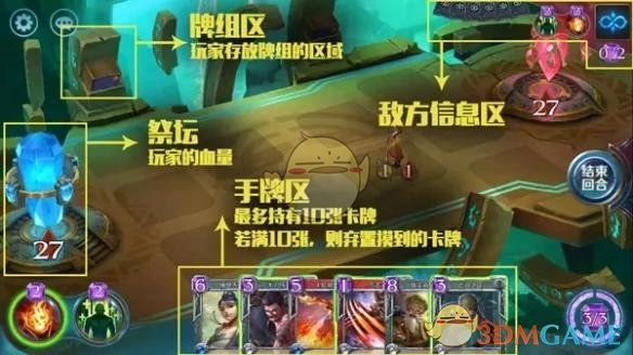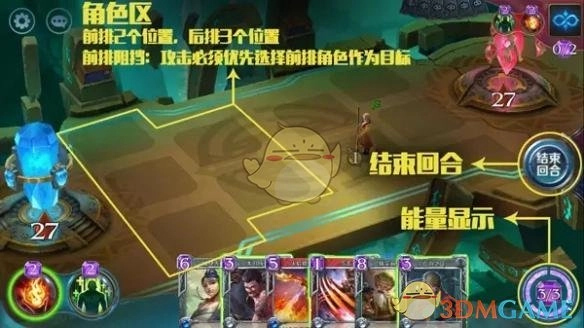2、角色区是我们进行战斗的核心区域,在此区域内,你能够自由组合角色站位,同时查看自身手牌与能量情况。操作完成后,即可结束该回合。