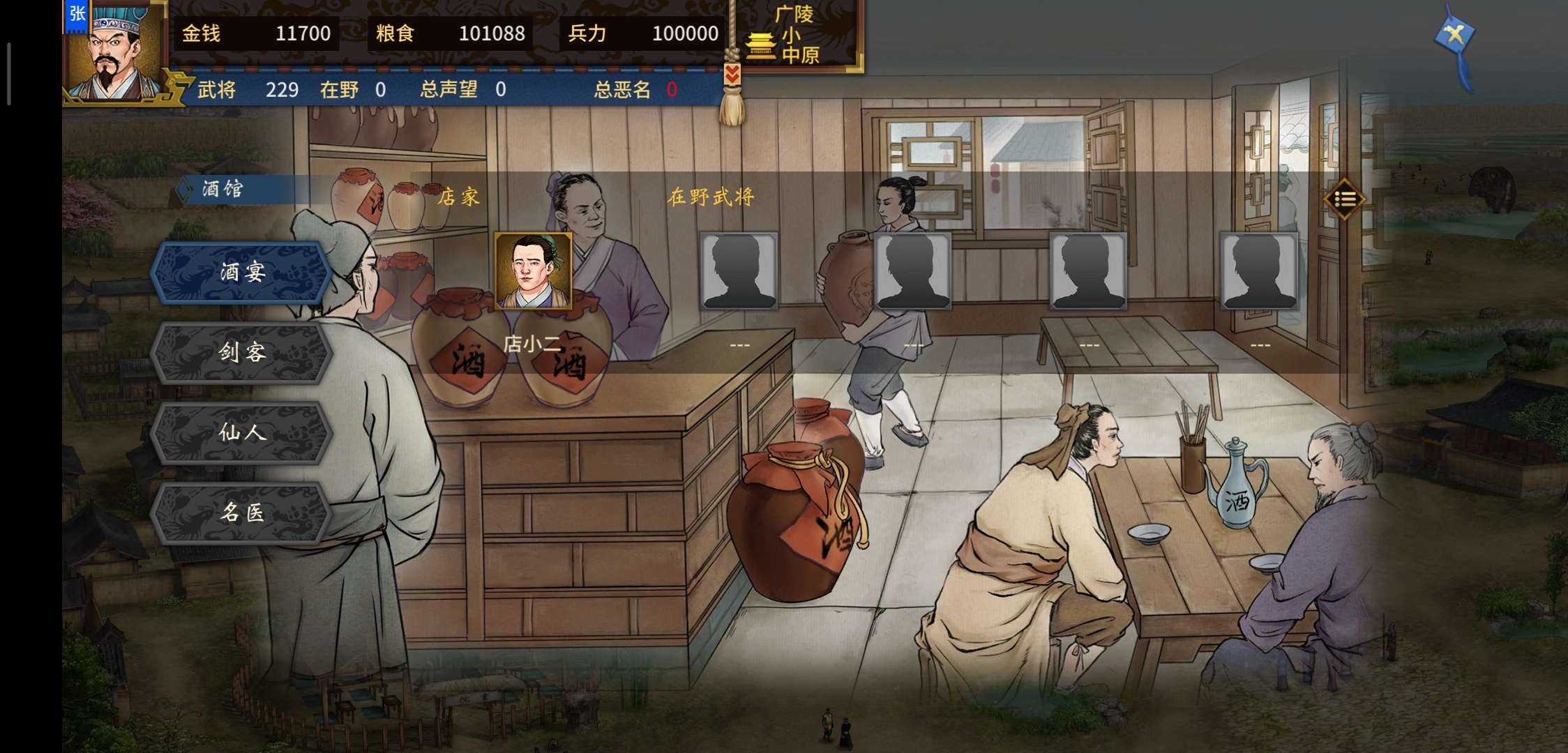 和武将门喝酒开宴席,可增加他们的忠诚度和少数亲密度