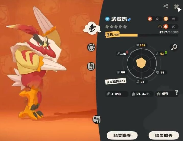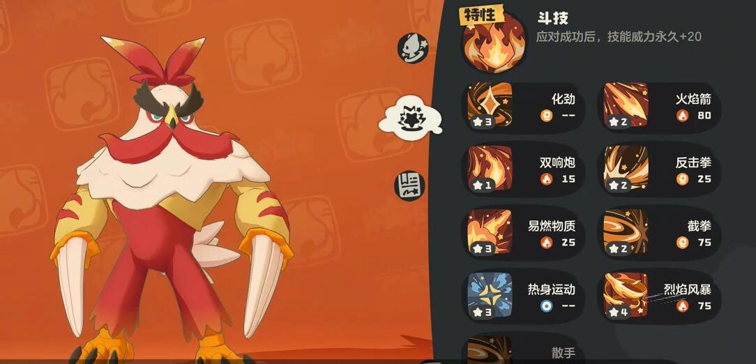 武者鸡被定位成物理爆发型输出角色。它的核心技能炎爆拳(火系物攻,威力85 )和折翼拳(武系物攻,威力95 ),共同构建起双属性打击链。在此推荐其配招方案为:炎爆拳、折翼拳、强健体魄(此技能可提升攻防)以及火焰冲锋(先手突进技能)。