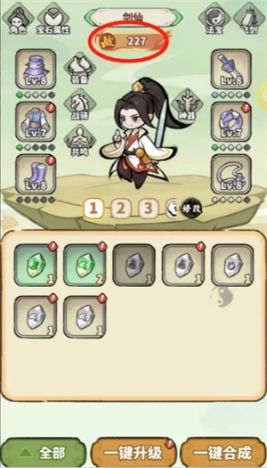 ①角色战力---装备升级---点击一键升级