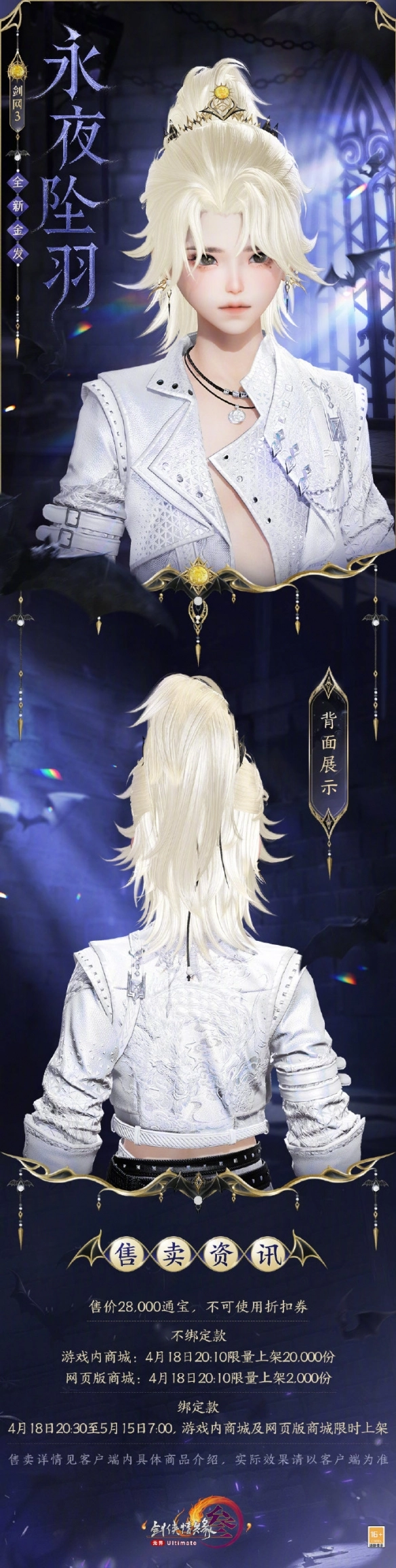 1、全新金发造型【永夜坠羽】定于2025年4月18日正式上线,该造型有不绑定与绑定这两种款式。