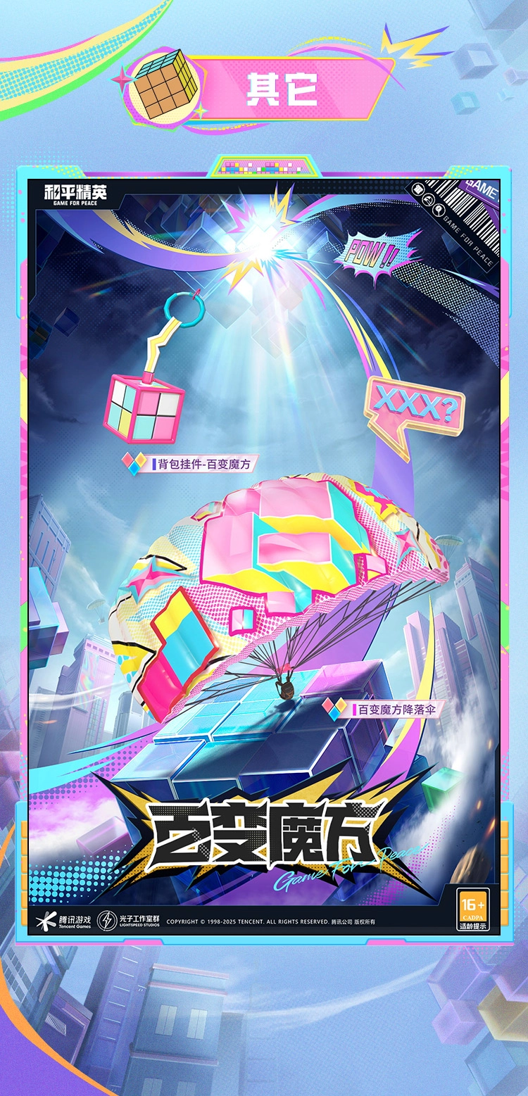 3、在配件上,“百变魔方背包”与“魔方降落伞”都延续了方块解构设计。背包表面有着3D立体纹路,而降落伞展开后呈现出缤纷色块矩阵,这两者进一步强化了“魔方世界”的主题感,官方将其称作“炸翻街的配置”。