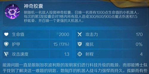 随机向一名敌人投掷神奇胶囊,可召唤出一个生命值为1000点的小机器人。每投掷3次胶囊,第3发会对1格范围内的所有敌人造成300/600/900点魔法伤害,同时使其眩晕1.5秒,并且还会召唤出一个更为强大的大机器人。