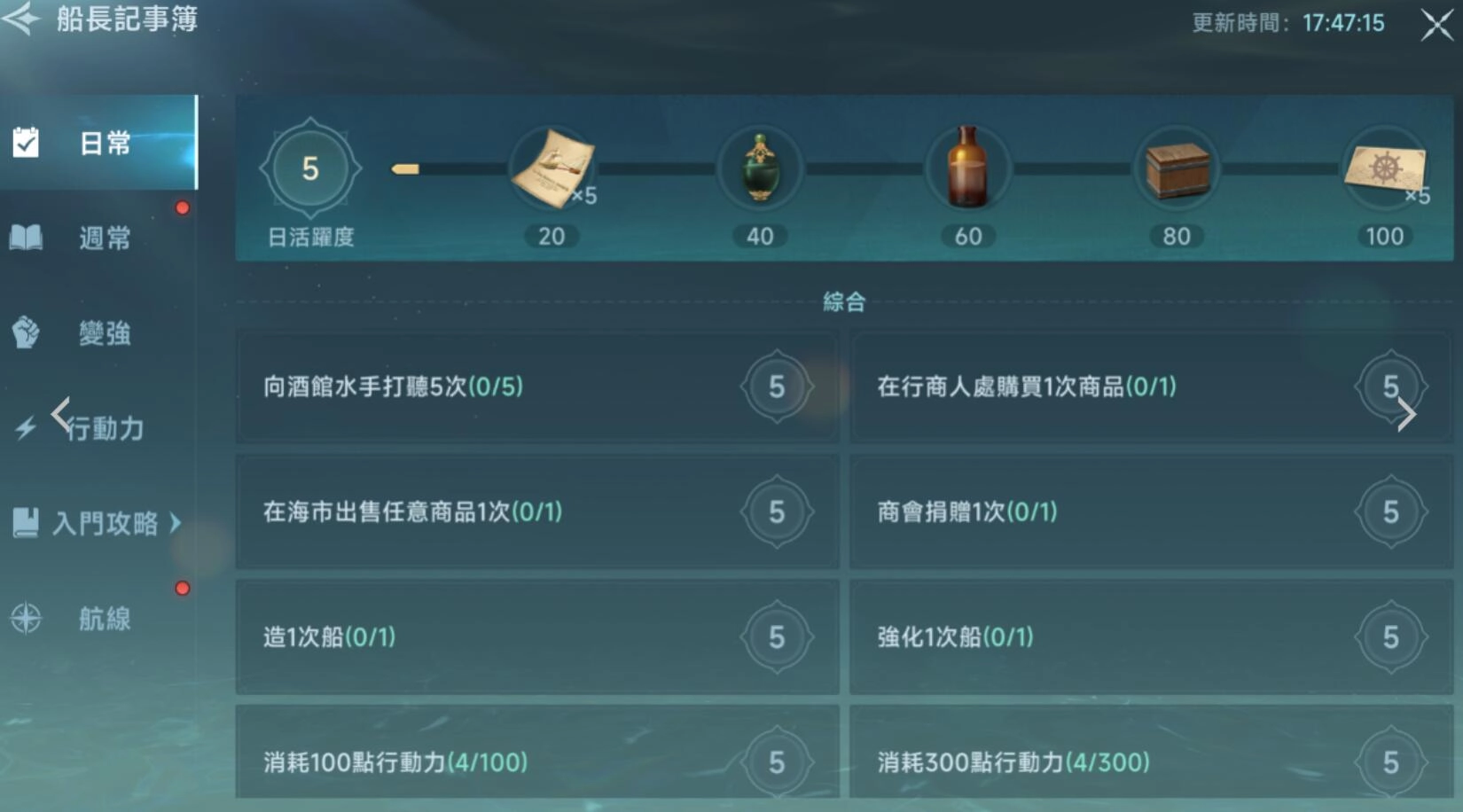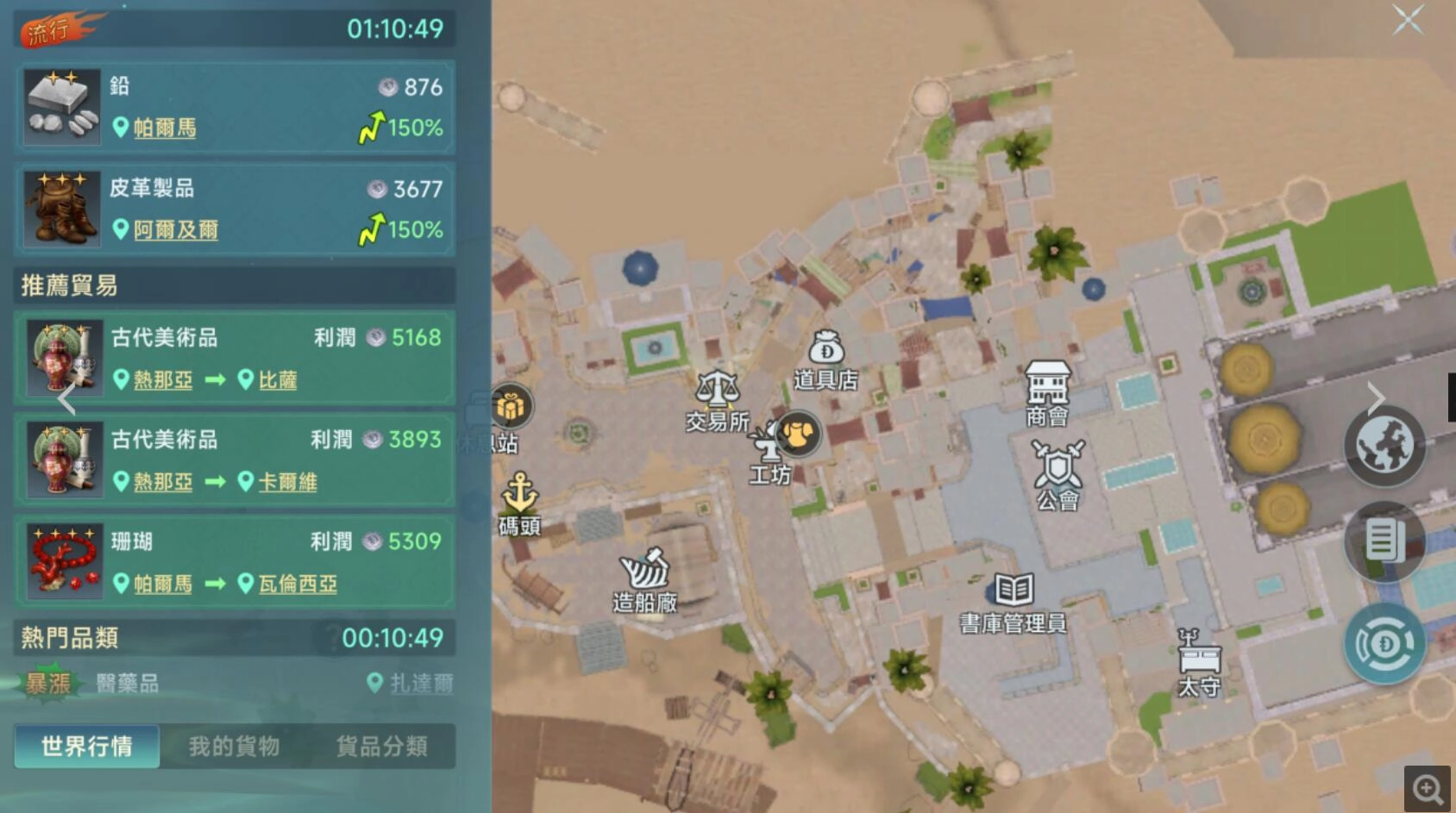在游戏初期,建议优先借助新手流行贸易机制,此玩法面向综合等级≤50或者商业等级≤25的玩家开放。在选择贸易路线时,推荐选取港口间距较近的,比如里斯本 - 伦敦葡萄酒路线,凭借较低的运输成本,能快速积攒金币以及采买书,采买书可是提升商店进货上限的关键道具。每天一定要领取国家奖励的500金币(在主界面点击国家进度条即可领取),长期积累下来,能有效缓解资金压力。另外,记得参与每日12:00和19:00的幽灵船活动,组队成功击败幽灵舰队后,可通过拍卖获得分红,单次收益能达到数千到数万金币,有了足够的金币,就能助力我们更快升级。