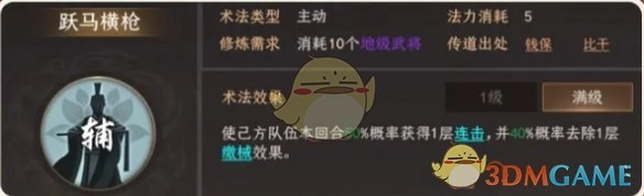 2、跃马横枪:己方队伍有50%的概率获取1层连击效果,该效果能额外增加普通攻击的次数,与土行孙的机制存在良好的联动。