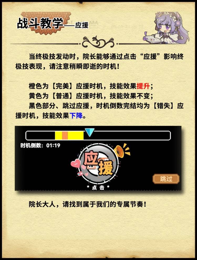 【完美应援】:轻点“应援”,要是指针恰好停留在橙色区域,便达成【心灵相通 - 完美应援】啦!届时,你的技能效果将获得大幅提升。