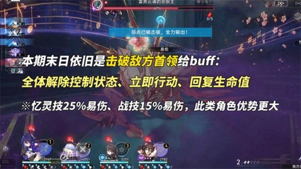 本轮幻影重点在于【快速击破】机制,每次成功击破Boss,我方全体成员会解除控制状态,即刻获得行动机会并回复生命值。借助环境增益,多数阵容无需设置专门的生存位,全力堆叠输出即可暴力通关。