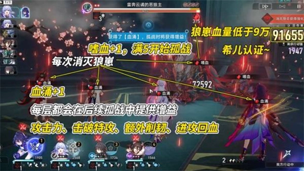 血涌buff是本次战斗输出的关键所在,它能够叠加攻击力、击破特攻以及回血等多种增益效果。面对呼雷时,不要贸然强攻,应先清理小怪来积累血涌,待与呼雷单独对战时再全力爆发。