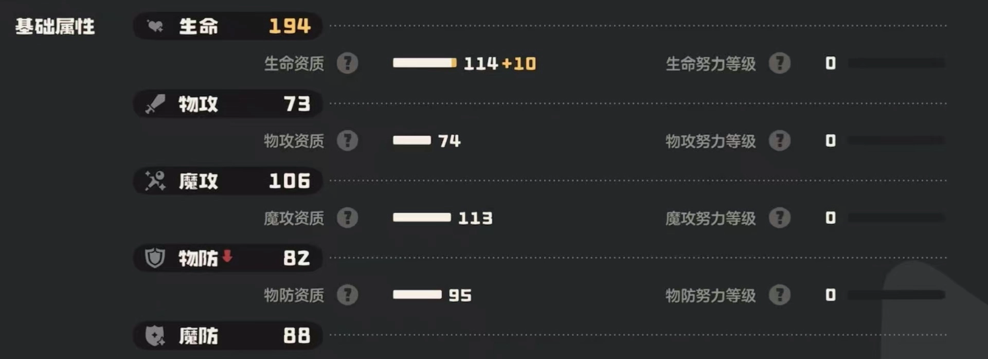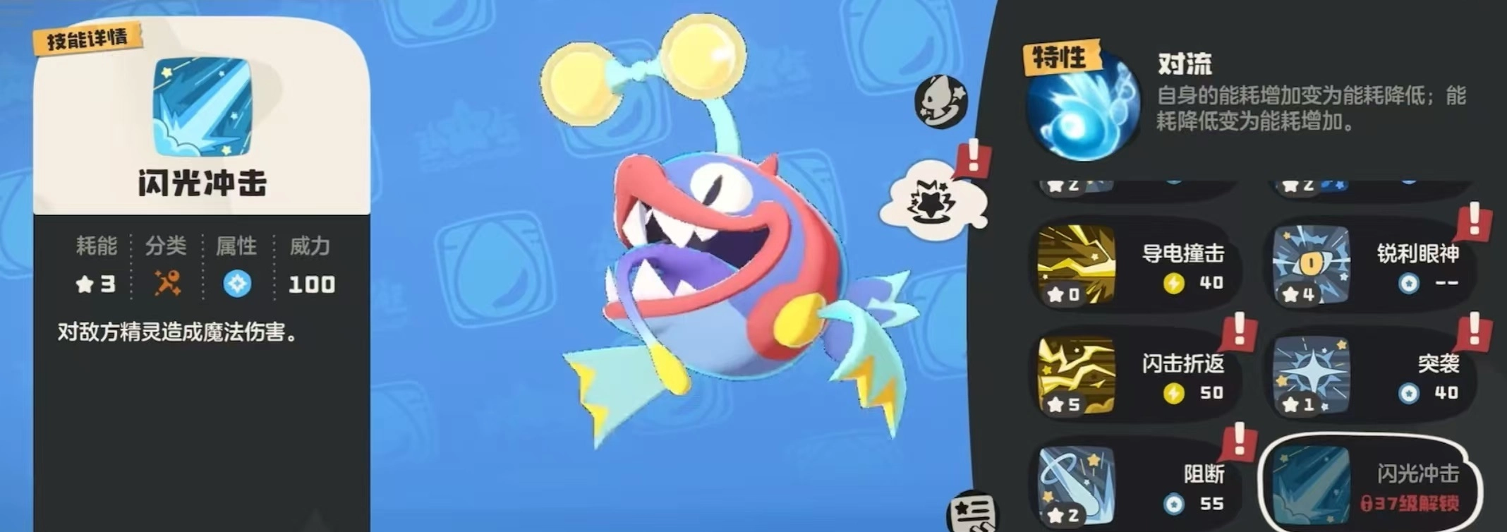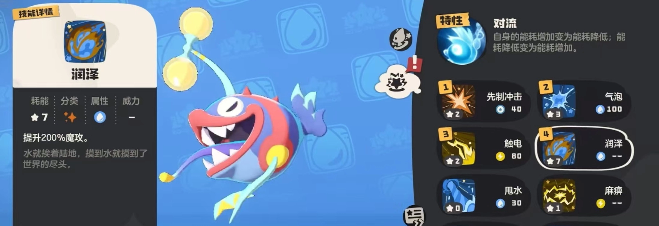 这只宠物的种族值总计583点,其中生命值与魔法攻击力最为突出,约110点上下。相比之下,物理攻击属性数值较低,其余几项属性则较为平衡,均在九十五左右。玩家运用对流特性时,能对自身能耗进行调整,降低能耗的过程饶有趣味。在技能选择上,大多会倾向以魔法攻击为主,比较推荐“水光冲击”技能,它能对敌人造成魔法伤害。