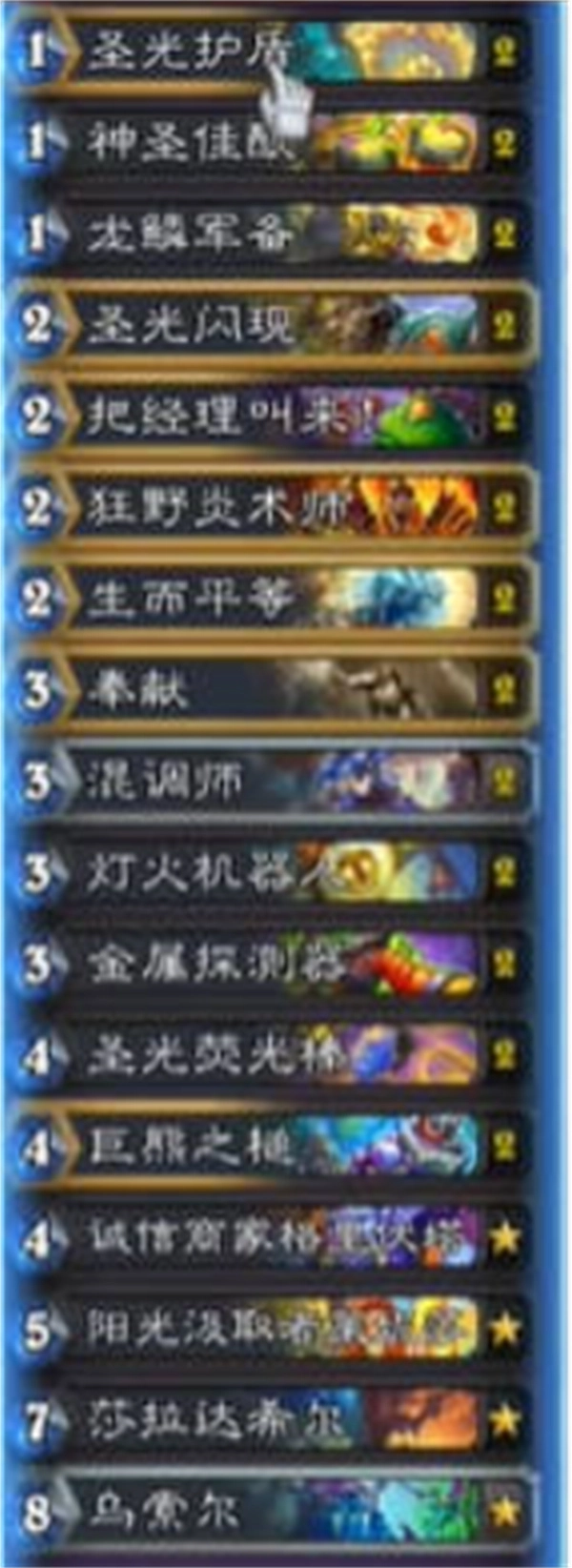 该卡组中的神圣法术,能助力你迅速召唤灯火机器人。一般而言,灯火机器人会在3费至8费阶段登场,拥有8/8的强大属性,堪称你对抗敌人的得力利器。
