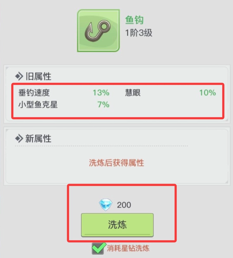 在正式开始钓鱼前,别忘记先用钻石对渔具进行洗炼。经过洗炼后得到的属性,主要可分为基础属性与稀有属性这两类。