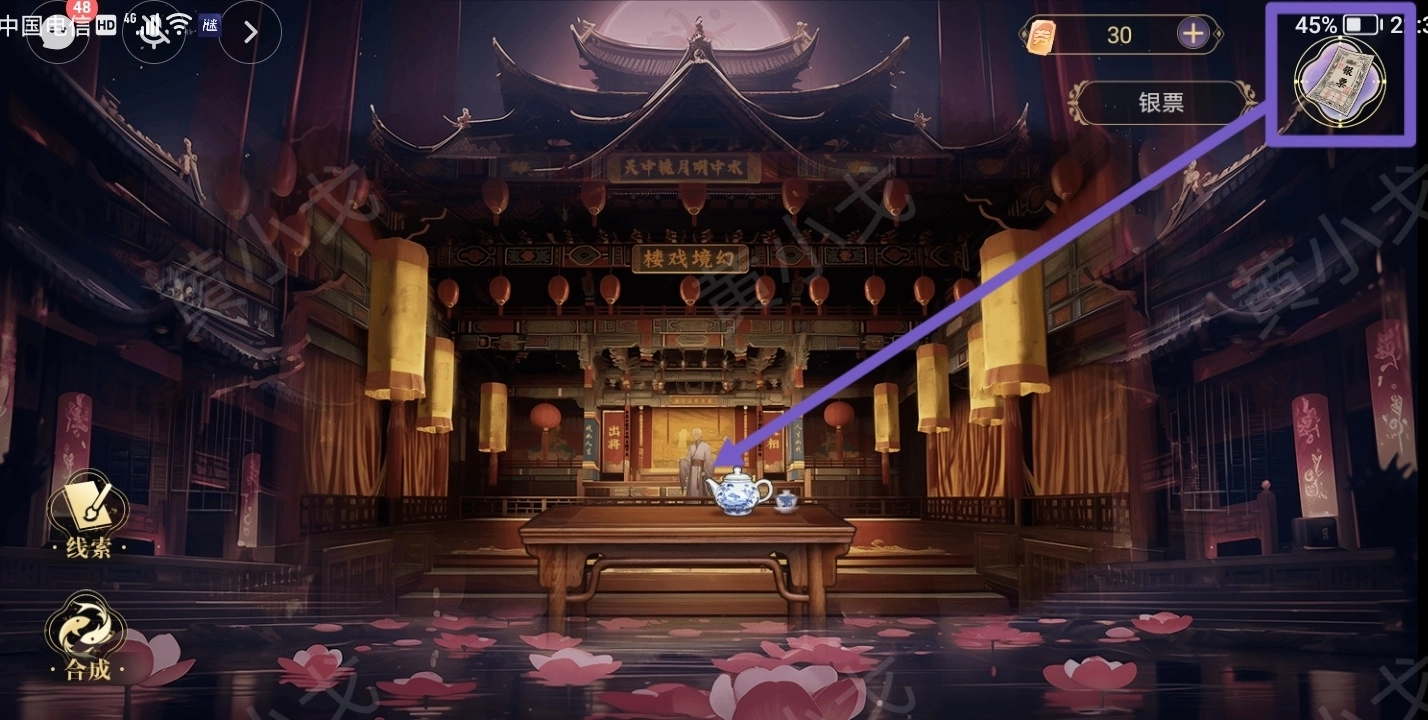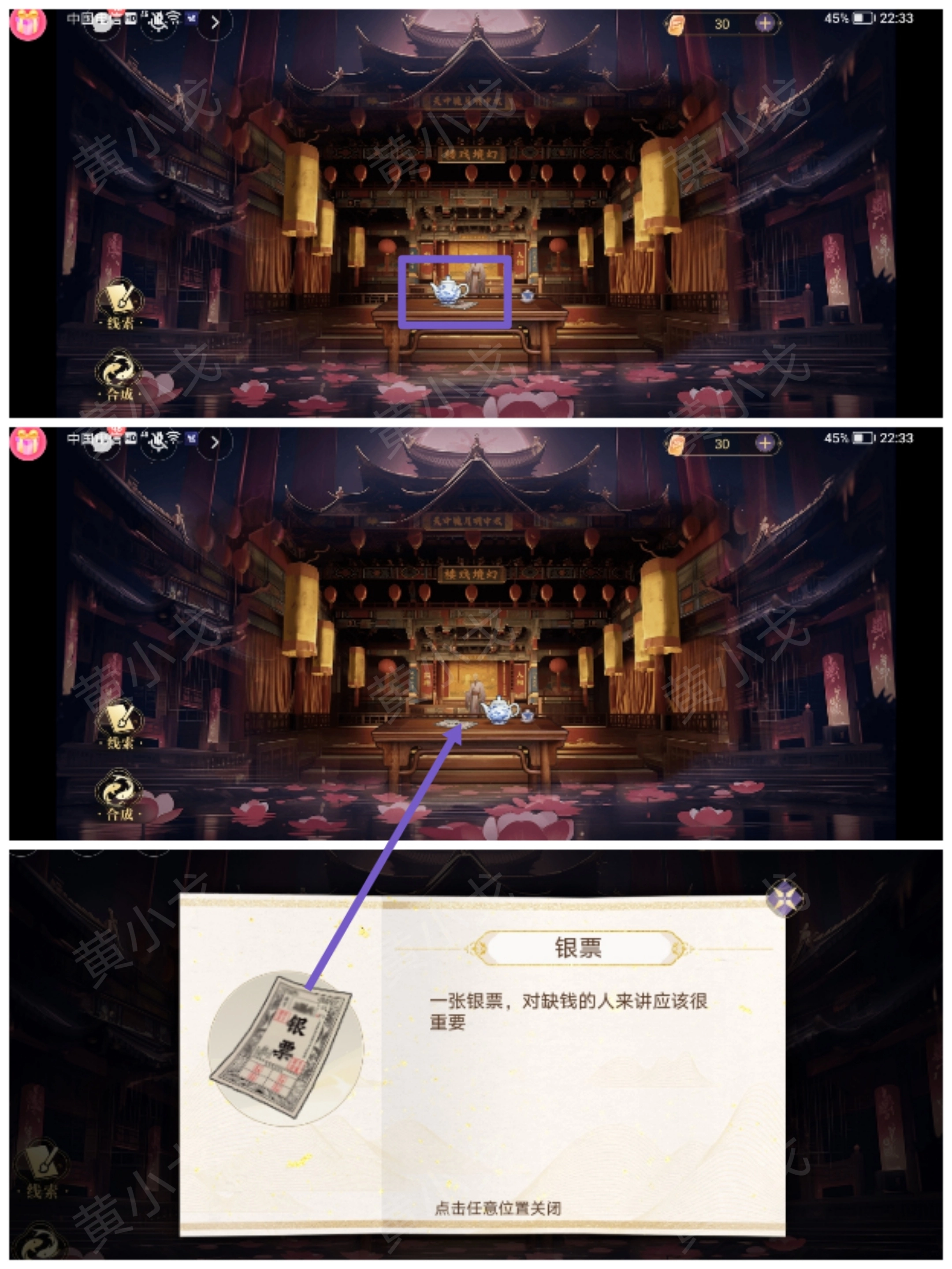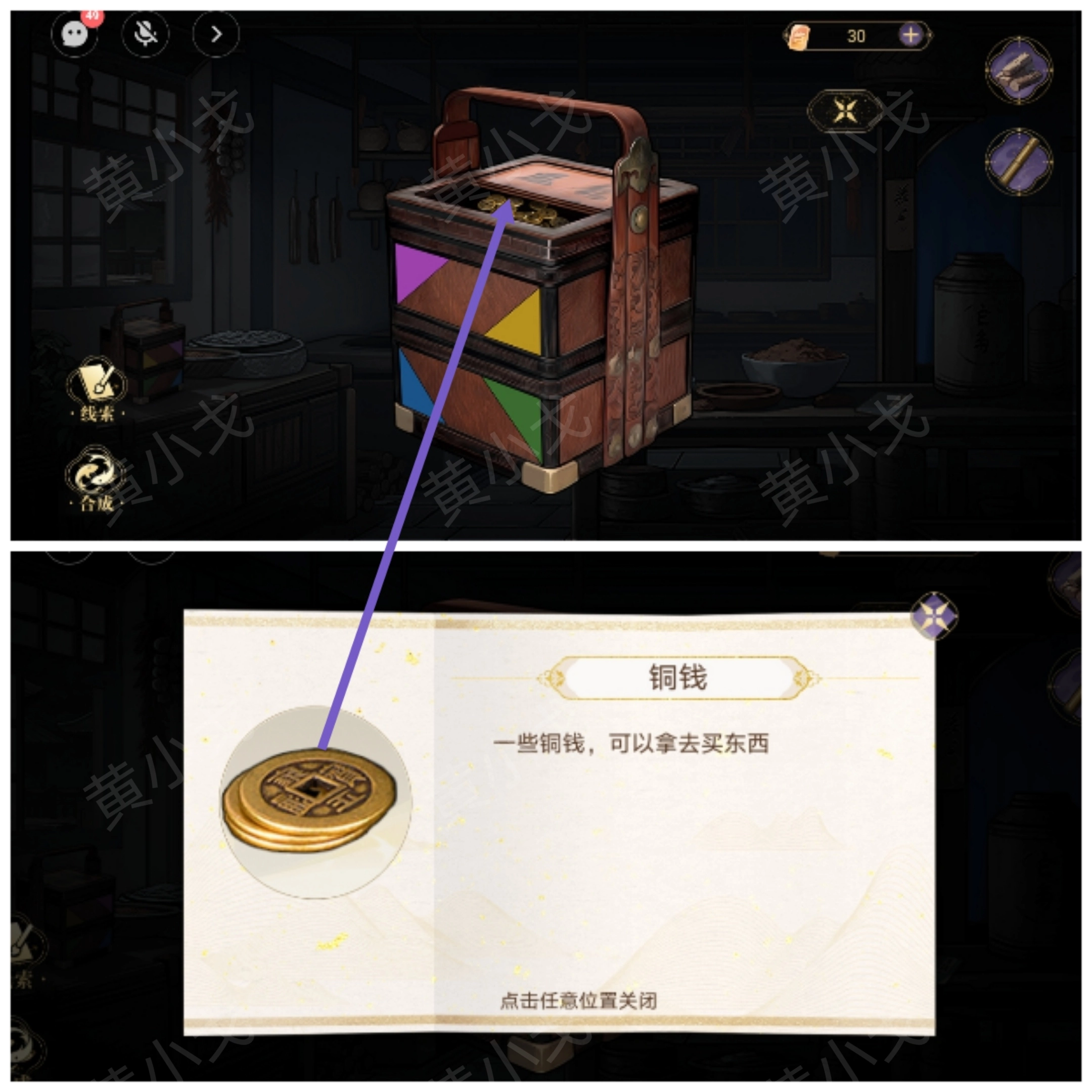 5.点击食盒,根据[客栈大堂]和[冷家村街道]上的酒坛线索,调整密码锁