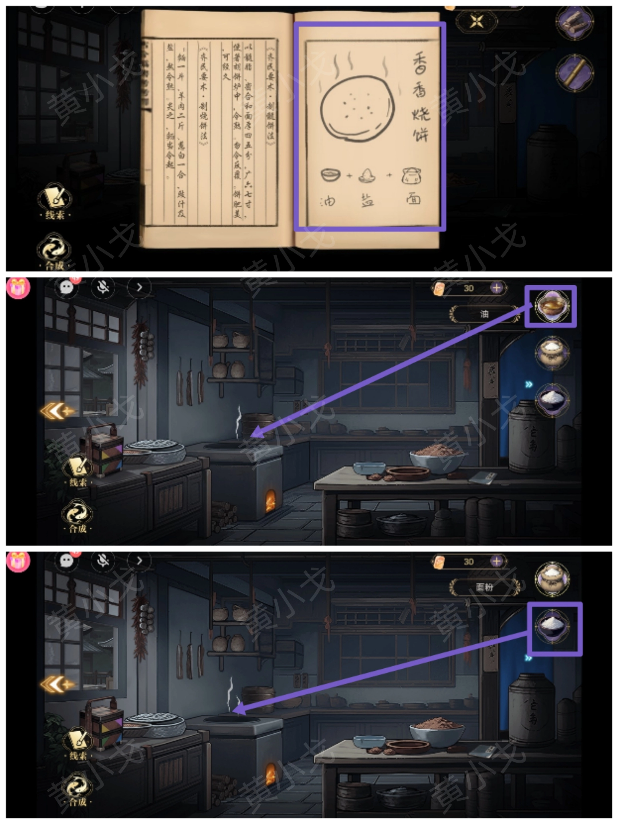 14. 按照食谱所给线索,将【油】、【面粉】以及【盐】一同放入锅中煎制,进而得到【自制烧饼】。