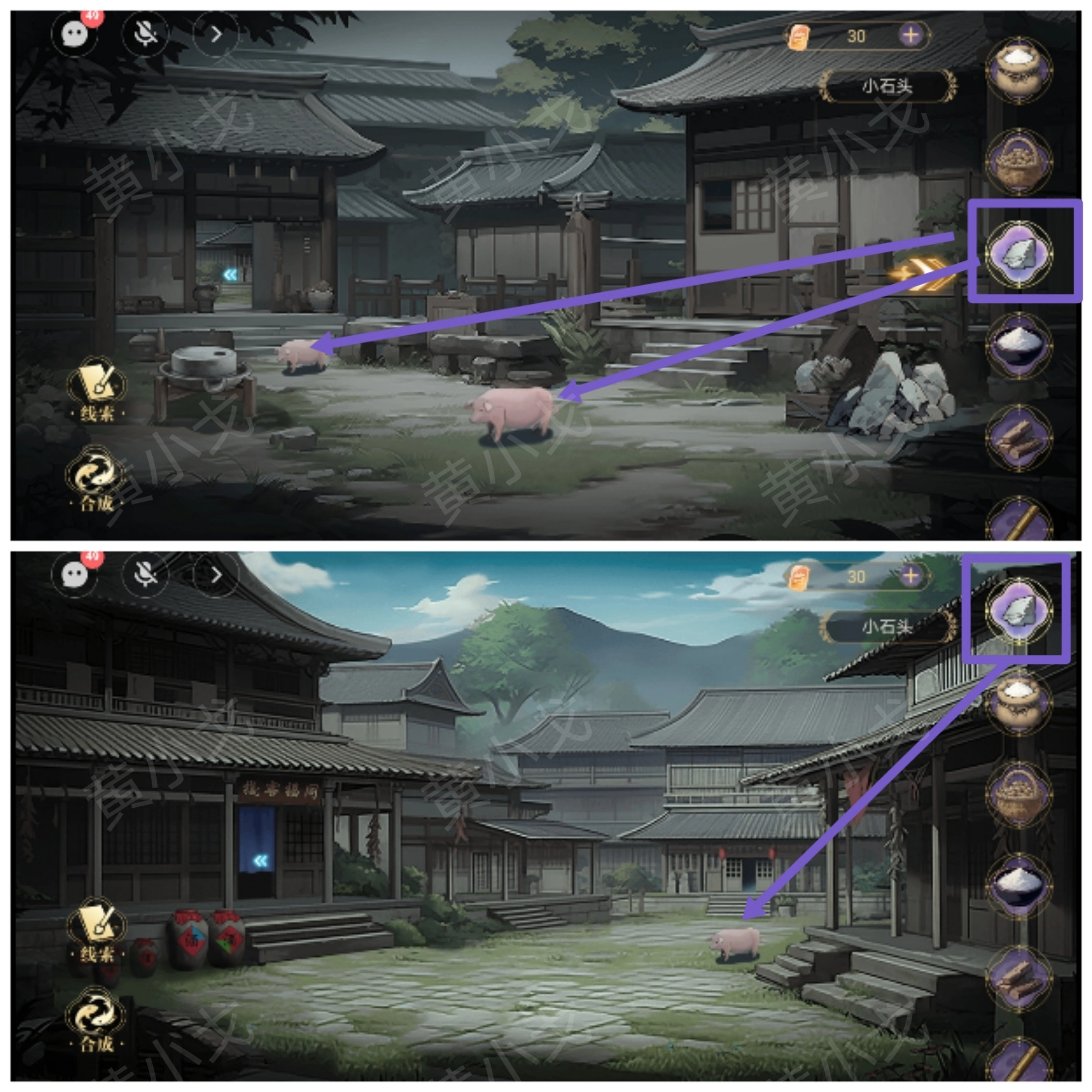 12. 拿【小石头】把后院以及街道上的猪给吓跑。