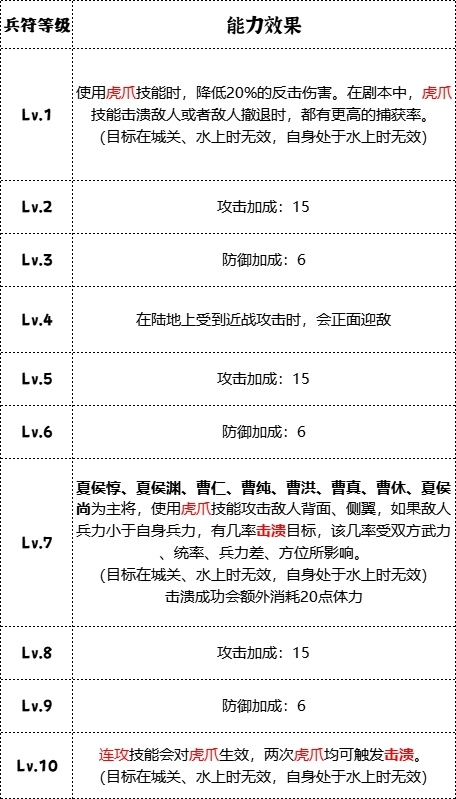 “虎豹骑”兵符总共分为10个等级,每个等级所带来的加成各有不同。