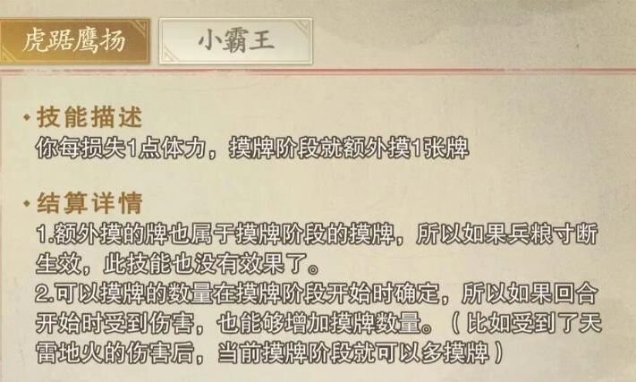 其次,这个角色的技能之间有着良好的联动。比如孙策的技能虎踞鹰扬就和他的身板适配。这个技能的强度非常高,其效果非常简单,就是伴随着体力的损失来增加自身的摸牌数量。在游戏当中,牌的数量可以同时提高你的上限和下限,这种效果能为你带来更多的选择。