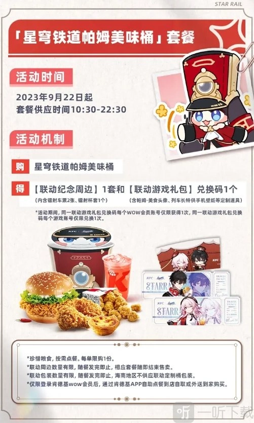 *KFC×崩坏:星穹铁道联动包装数量有限,随餐发完即止。海南地区不供应联动定制桶包装。