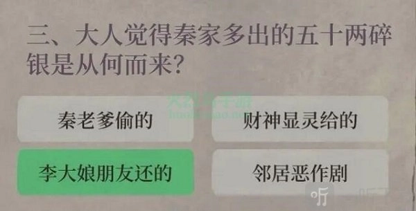 3. 提供的选项是:秦老爹偷走的,财神显灵给予的,李大娘朋友归还过来的,邻居进行的恶作剧。正确答案:李大娘朋友还的