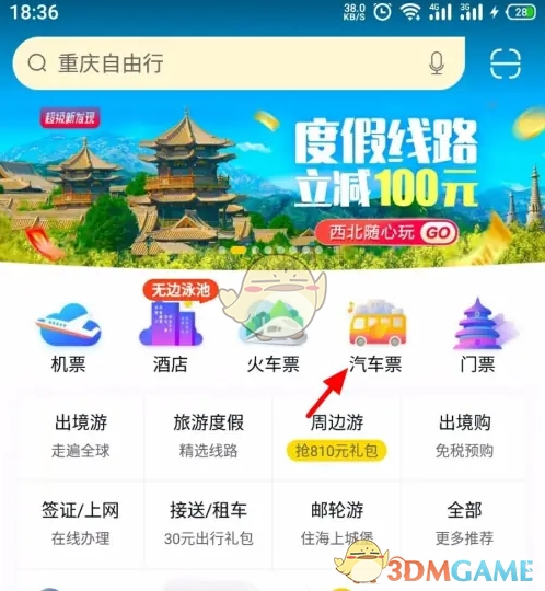 1. 于飞猪首页,点击汽车票选项。