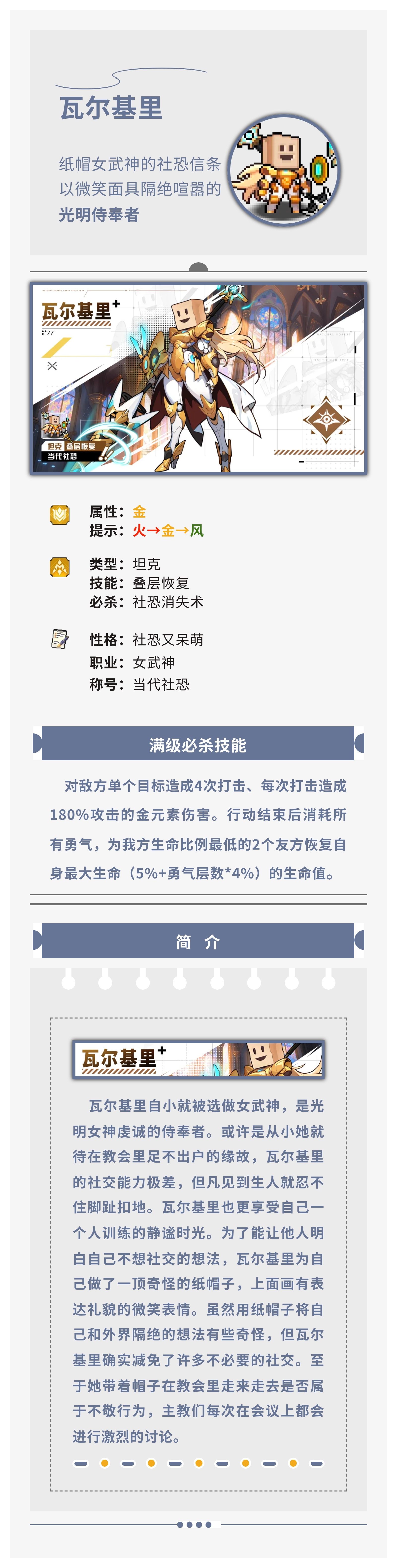 瓦尔基里自幼便被选为女武神,是光明女神忠实的侍奉者。也许是因为她从小就一直待在教会,极少外出,瓦尔基里的社交能力相当薄弱,只要一见到陌生人,就尴尬得脚趾抓地。相比之下,瓦尔基里更喜欢独自训练时那种静谧的时光。接下来为大家带来《龙王大人》中瓦尔基里的技能介绍!