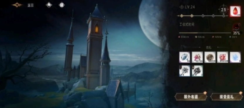 接着是古堡的盈月贡礼,其实就是前面提到的收菜。每天只需进行布道,就能自动产出养成资源,自身等级越高,获得的物资就越丰厚。等级主要依靠推进主线和困难关卡来提升。布道首次免费,第二次需花费50钻,第三次70钻,第四次100钻,此后花费会逐步升高,大家可依据自身情况进行选择。