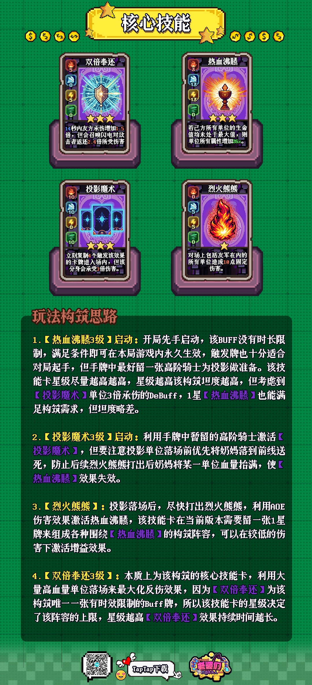 4、【双倍奉还3级】:此乃该构筑的核心技能卡。通过众多高血量单位上场,实现反伤效果的最大化。由于【双倍奉还】是该构筑里唯一一张存在时效限制的Buff牌,因而这张技能卡的星级,直接决定了该阵容所能达到的上限。星级越高,【双倍奉还】的效果持续时间就越久。