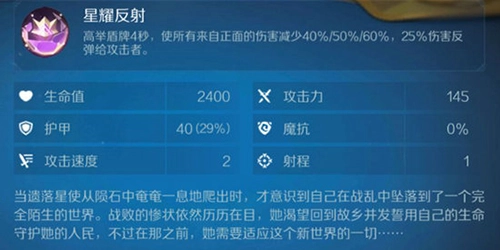 持续高举盾牌4秒,可让来自正面的所有伤害降低40%/50%/60%,同时将25%的伤害反弹给攻击者。