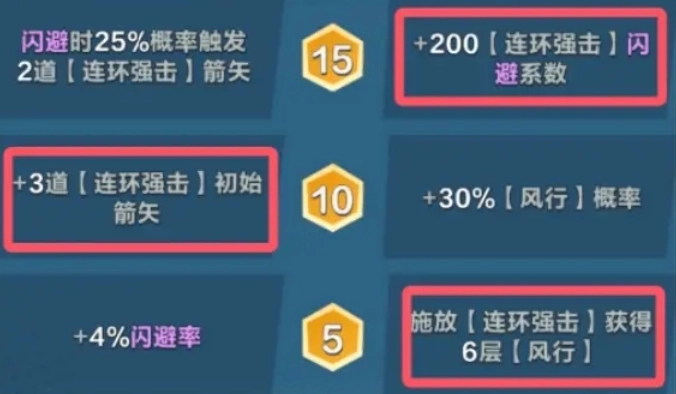 当角色达到10级这一关键节点时,左边“3道连环强击初始箭矢”的天赋选项,为角色的攻击手段带来了更多变化。到了15级,建议优先选择右边“+200连环强击闪避系数”的天赋,该天赋进一步强化了与闪避相关的攻击属性,让角色在闪避敌人攻击的同时,还能对对手进行输出。在实际对战中,使用风行之灵这个英雄时,尽量在拥有大招的对局里释放大招,因为风行之灵的基础闪避在闪避型英雄中处于相对较低的水平。不过,其被动技能所提供的25点闪避效果是始终存在的。