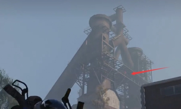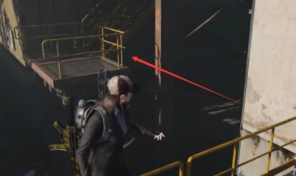 6、此刻,玩家需前往仓库二楼,接着跳到对面烟囱的楼梯处。