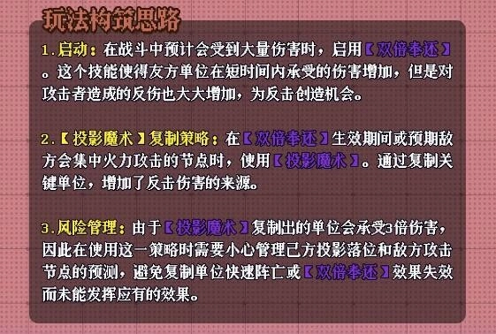 3、风险管理:鉴于【投影魔术】复制出的单位会遭受3倍伤害,所以运用这一策略时,务必谨慎规划己方投影的落点,并精准预测敌方的攻击节点。如此,方可防止复制单位迅速阵亡,或是【双倍奉还】效果失效,从而确保该策略发挥出应有的作用。
