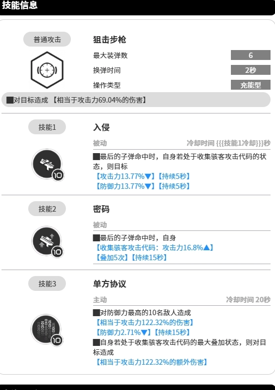 数据入侵,是艾可希雅的招牌技能之一。当蓄力攻击精准命中目标后,角色即刻进入骇客协议状态,此状态持续8秒。在这充满神秘氛围的状态下,角色的双防会稍有下降,降幅为13.77% 。这看似不利的改变,实则是一种精妙的战术牺牲。与之交换的是,角色每秒能获得1.2%的攻击增幅叠加,这种增益效果最多可累积10层。因此,在这8秒时间里,她的攻击幅度会持续叠加提升,最终爆发出来的力量将极为惊人。