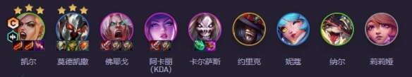 以下几位英雄分别是:凯尔、莫德凯撒、佛耶戈、KDA系列皮肤的阿卡丽、卡尔萨斯、约里克、妮蔻、纳尔以及莉莉娅。