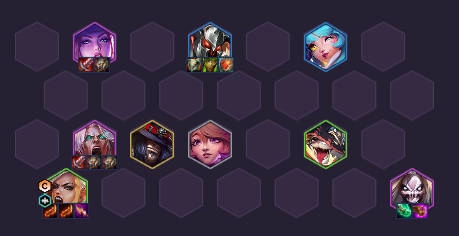 阵容全员按照KDA格子站位,天使和死歌分别站在一个角落。佛耶戈与天使站在同一侧,协助天使迅速突破前排。阿卡丽则与对手的主C相对站位。在阵容选择上,优先选取天使五杀天选,成型后能凑齐7五杀羁绊。只有在需要苟分的情况下,才选择刀锋天选,以达到7/8人口时的强度。