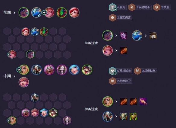 1、前期可用安妮、金克斯、飞机等一费卡天选来打工过渡,金克斯最为强力且适配。若是疾射天选,就补充秘术或护卫前排;要是朋克天选,则以4朋克2疾射过渡。