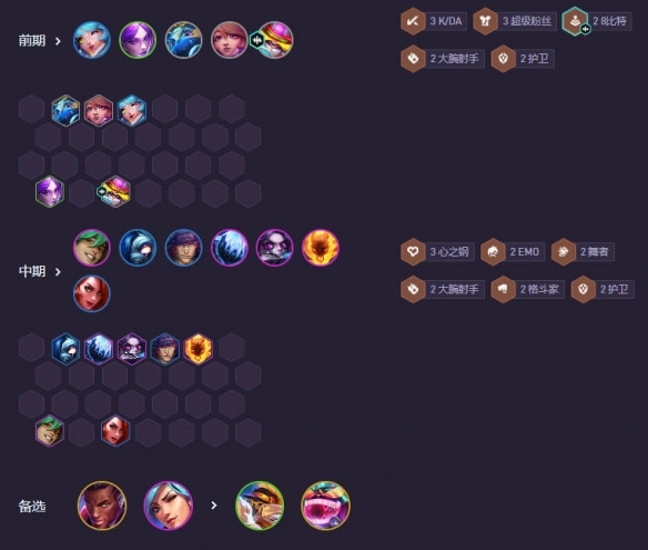 前期借助超级粉丝与天选飞机进行过渡,待等级提升后,增添更多前排,选择护卫格斗就可以了。
