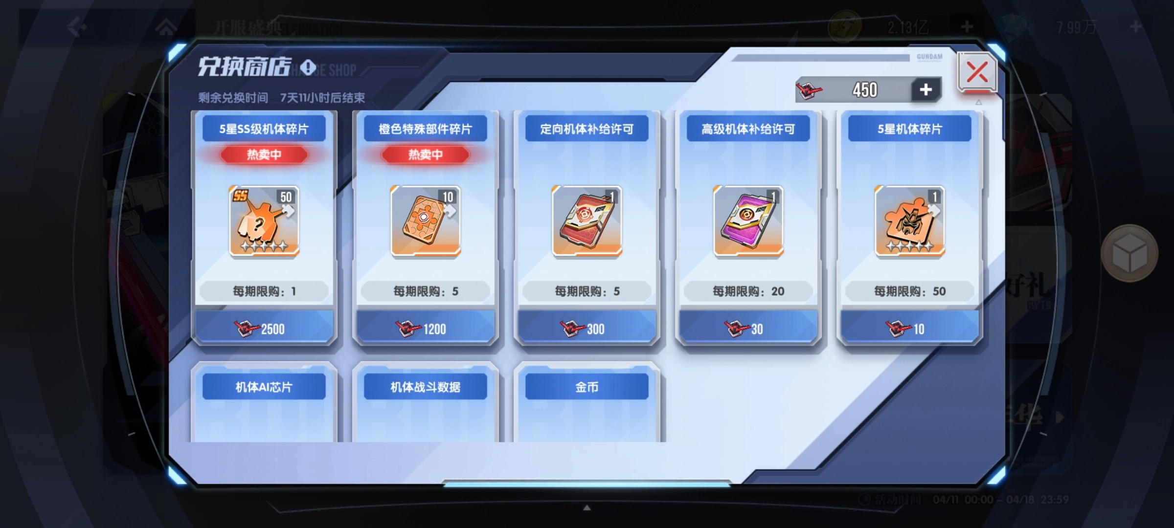 15. 部分限时活动设有商店,像抽取部件的活动就有。目前没办法截取相关图片。在这类活动商店里,会依据你活动积分的数量来做选择推荐。优先建议购买限购1个的金色部件箱子,其次是橙色特殊部件碎片,最终目的是合成红色部件。