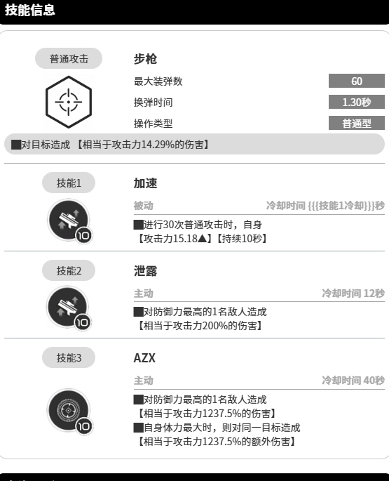 并且,换弹时间仅需1.30秒即可完成。如此短暂的换弹时间,在战斗中能使她在弹药耗尽后迅速补充弹药,始终保持强大的战斗力。同时,它采用普通型操作,简单易懂,玩家能够轻松掌控。尽管单次攻击造成的伤害仅为自身攻击力的14.29%,看似并不突出,但千万别轻视每一次攻击。要知道,武器的子弹数量众多,当60颗子弹如暴雨般倾泻而出,综合计算,普攻技能造成的总伤害相当可观,足以对敌人形成强大的火力压制。